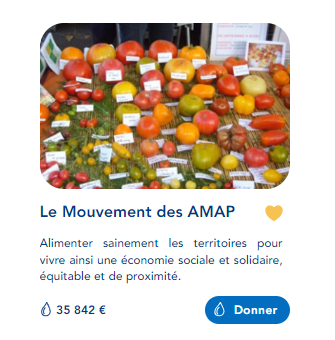 | Comment cela va se passer ? C’est le "Mouvement des AMAP" en France qui est mis en avant, porté par le Miramap. Le Miramap va récolter les sommes et cela sera redistribué ensuite aux réseaux. ♦ |