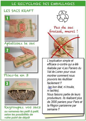 Dans le souci de préserver l’environnement, notre objectif est de réduire le gaspillage et de faire progresser la ré-utilisation des emballages que nous utilisons pour vos fruits et légumes. Quand cela est possible, nous évitons d’utiliser des emballages secondaires. Avec du «très frais», c’est presque mission impossible … (d’où l’utilisation des sacs pastiques biodégrable). Nous réutilisons au maximum les emballages suivants : les sacs kraft de vos paniers, les sacs primeurs et les boîtes à œufs (surtout celles de 6). En 2017, notre projet sur le recyclage est de faire fabriquer nos sacs en toile de jute et intérieur imperméable. Chacun d’entre vous possédera 2 sacs, ce qui nous permettra la rotation au fur et à mesure de vos livraisons. Bien sûr nous vous en reparlerons le moment venu. Une solution encore plus écologique, plus économique, avec une meilleure durée de vie. A nous vous, c'est un geste de plus pour la planète! |