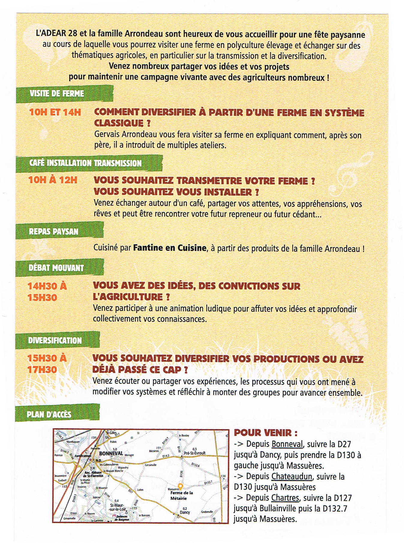 L'ADEAR 28 et la famille Arrondeau sont heureux de vous accueillir pour une fête paysanne au cours de laquelle vous pourrez visiter une ferme en polyculture élevage et échanger sur des thématiques agricoles, en particulier sur la transmission et la diversification.